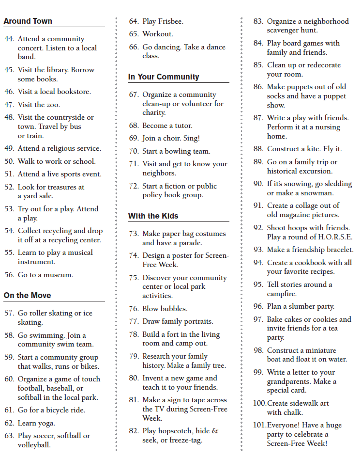 Want more detailed possibilities? Here’s a list of 101 great screen-free activities, courtesy of the CCFC: