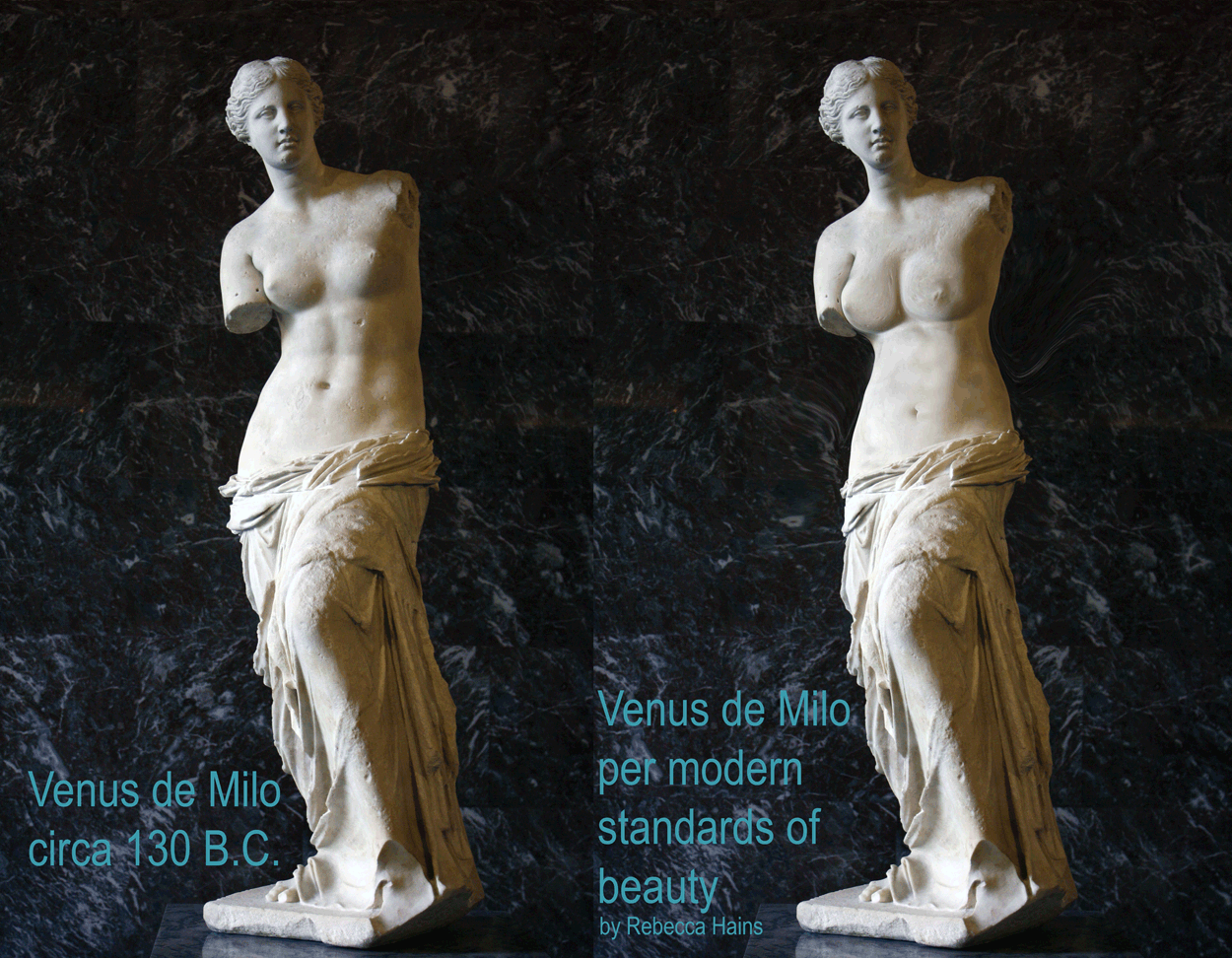 So, I decided to retouch the Venus de Milo myself using Photoshop. Here she is, in her original form and again by today’s beauty standards–in a form that modern teens might find beautiful, rather than laughable: