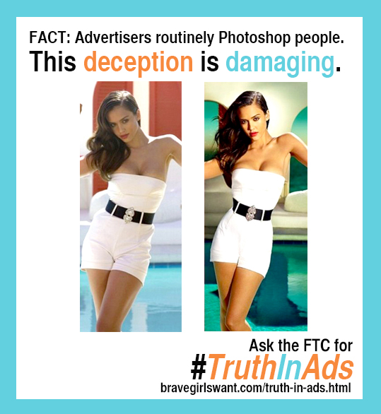 But because not all advertisers are willing to discontinue this practice, the Brave Girls Alliance also wants the FTC to develop a regulatory framework prohibiting advertisers from materially altering people’s bodies. We’ve made this request via the bi-partisan Truth in Advertising Act (TIAA), which we introduced in the U.S. Congress in 2014. Here are some examples of what we mean by “material alterations”: