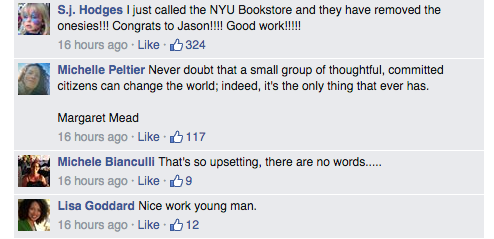 He alerted several student and alumni groups, and they complained to the bookstore. In fewer than eight hours, the bookstore had removed the onesie from its shelves.
