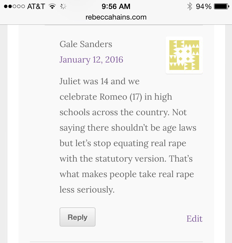 Elsewhere in the comments, another commenter offers a similar justification to support the idea that underage girls should be considered able to consent to sex: The fictional Elizabethan tale of Romeo and Juliet.