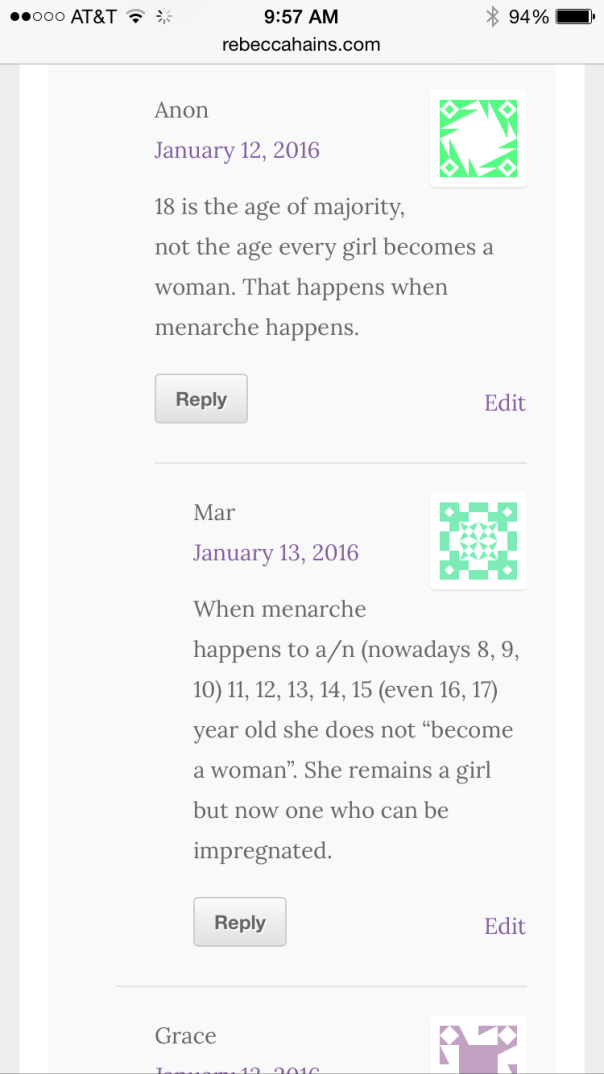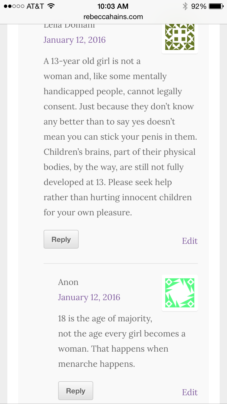 But an anonymous commenter responds that girls are women who can consent to sex, if they’ve had their first period.