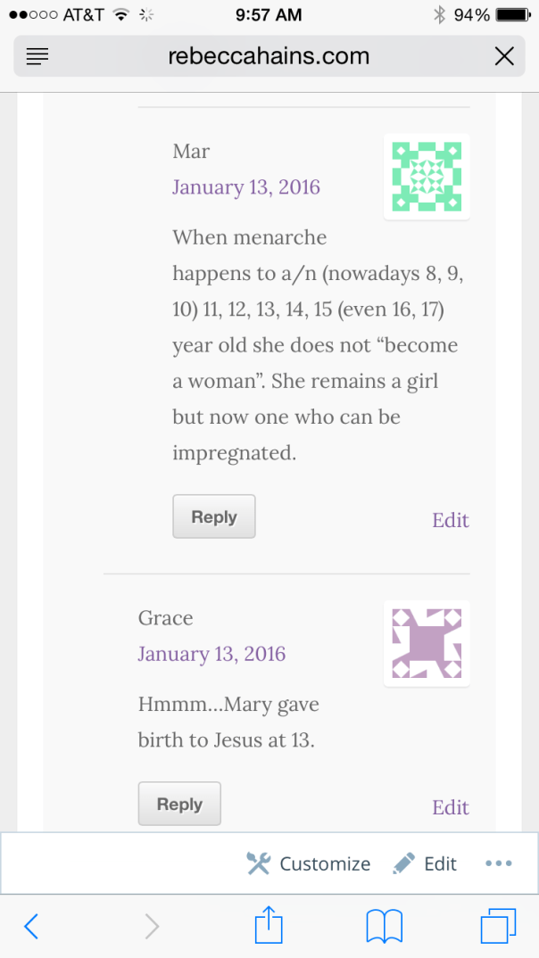 In response to this, another commenter reaches back 2,000 years to Biblical times and replies: “Hmmm…Mary gave birth to Jesus at 13.”