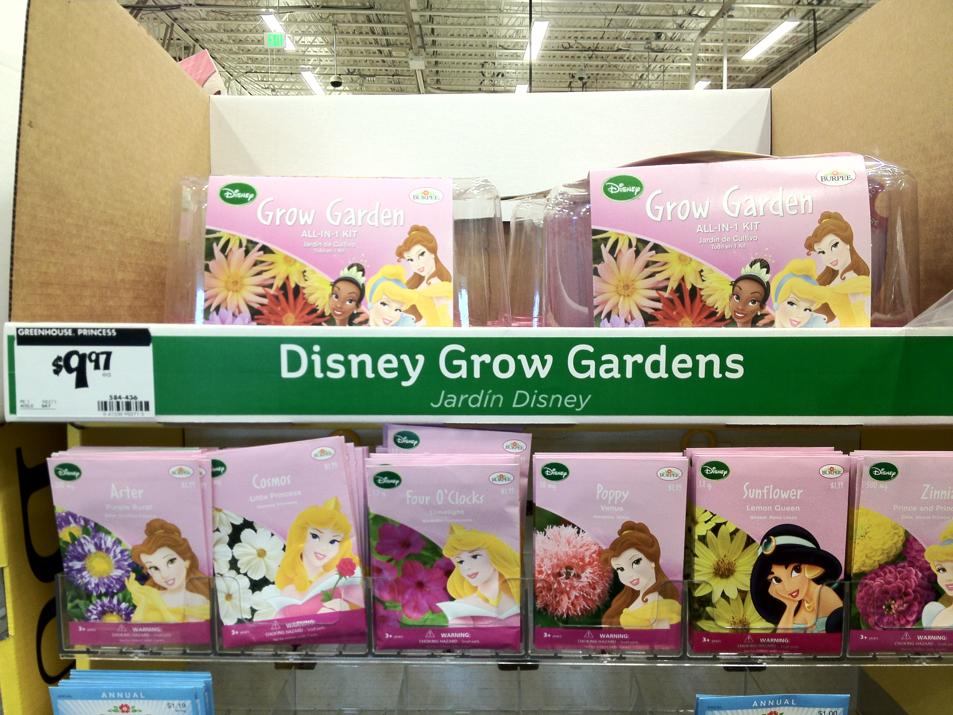 Note: I took these photos at my local Home Depot about a month ago. This week, the princess-branded flower seed packets are nearly entirely sold out, while most of Mickey and friends’ vegetable seed packets are still in stock.