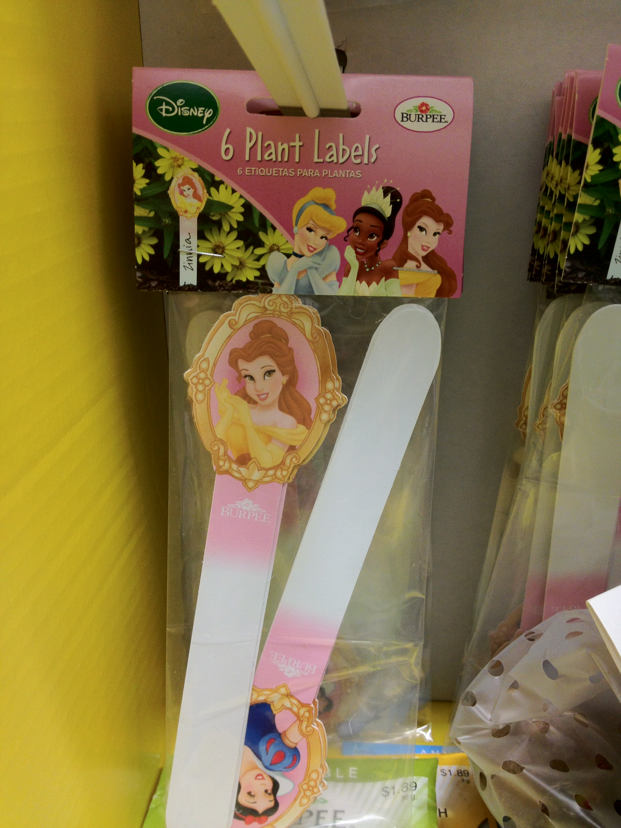 Oh, and don’t forget the princess-themed plant labels, which cost $2.97 for a package of six–way more than the plain ones, which cost $1.99 for a package of twenty. Yikes.